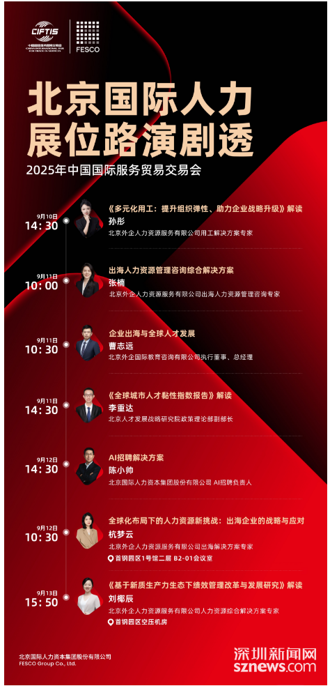 深圳新闻网2025年9月5日讯(记者 董非)9月10日,2025年中国国际服务贸易交易会(简称“服贸会”)将在北京首钢园盛大启幕。作为服贸会官方合作供应商,北京国际人力资本集团股份有限公司(简称“北京国际人力”,品牌“FESCO”)将以“汇聚”为主题,于首钢园13号馆供应链及商务服务专题展区(展位号:S13T25)精彩亮相,通过“城市汇聚”“科技汇聚”“效能汇聚”三大核心板块,全方位呈现其在全球人才服务领域的创新实践与卓越成果。