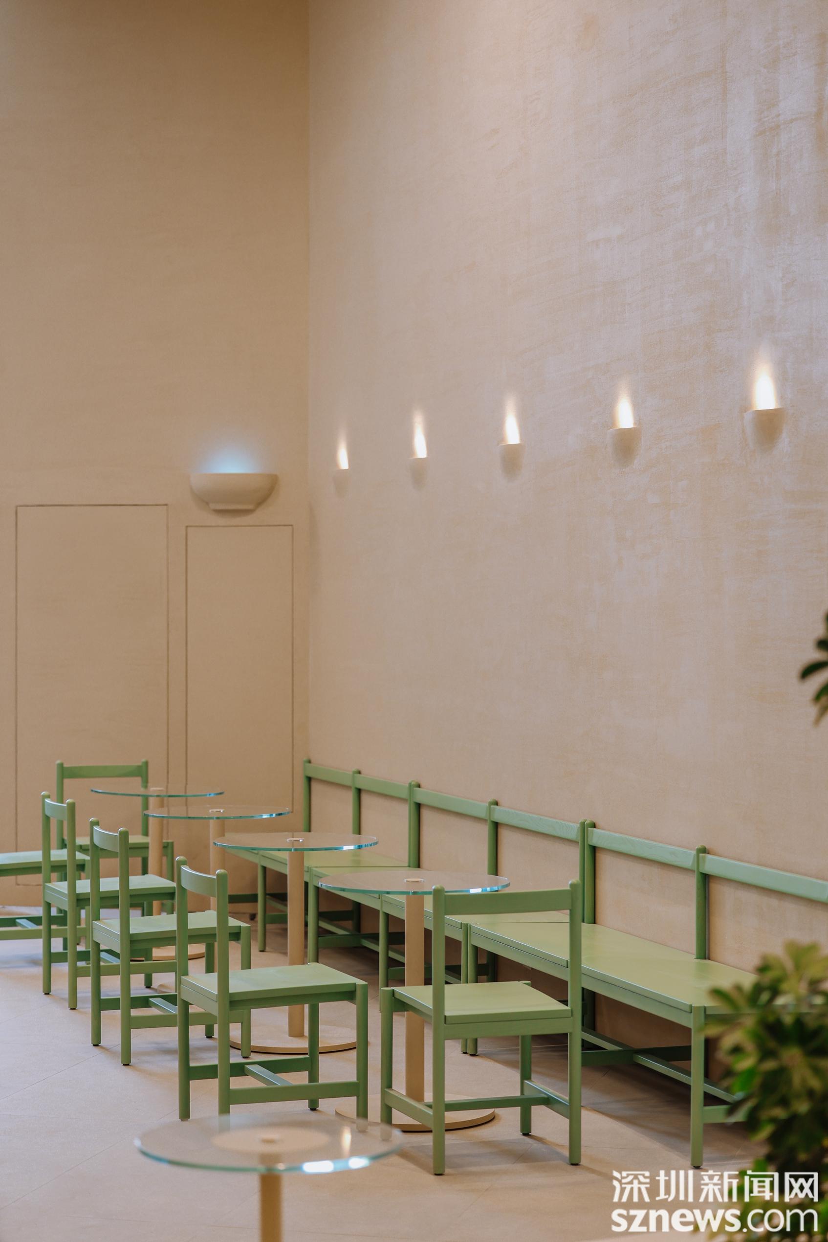 蓝瓶携手Wrk-Shp设计团队,以“自然的平衡”为理念,将深圳湾昔日的潮汐地貌与现代美学融入空间构筑。步入门店,米色基调与层次丰富的饰面渐次铺展:粗粝墙面如沉稳巨石,潮汐冲刷的圆石以巧妙形式融入其中。咖啡吧台不锈钢材质的台面与周围的自然色调形成鲜明对比,宛如岩石中的珍稀金属。刚与柔、自然与现代在此交织。由SUN AT SIX特别制作的座椅与长凳采用双重绿色调,环绕中央绿植,勾勒出轻盈生动的绿意场景,烘托都市绿洲的氛围。