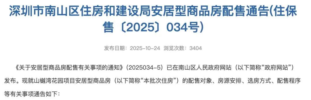 深圳新闻网2025年10月25日讯(记者 郑梓安)10月24日,深圳市南山区住房和建设局发布通告,面向全市安居型商品房在册轮候家庭、符合条件的领军人才、非在册轮候申请家庭公开配售山樾湾花园项目,共3466套安居型商品房。这也是南山安居房山樾湾首次面向库外符合申请条件的家庭配售。