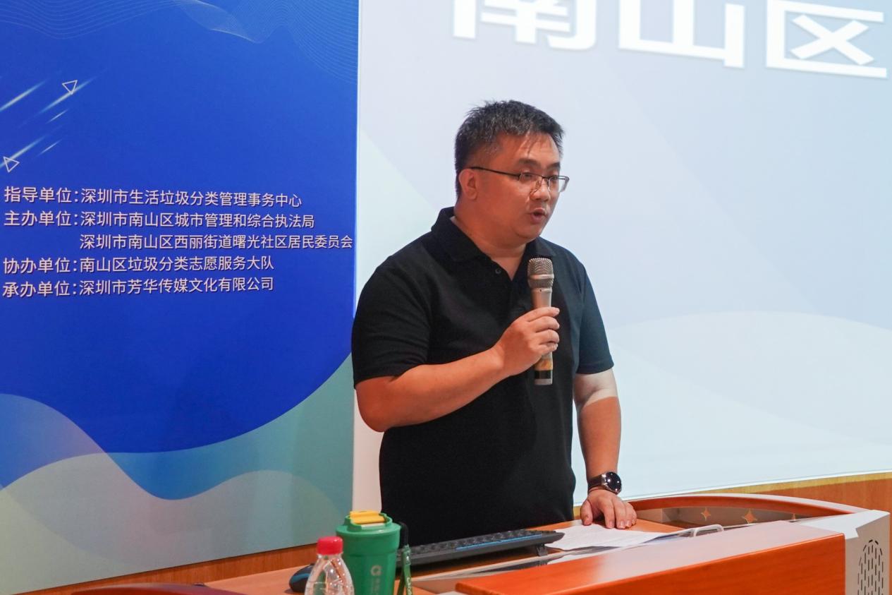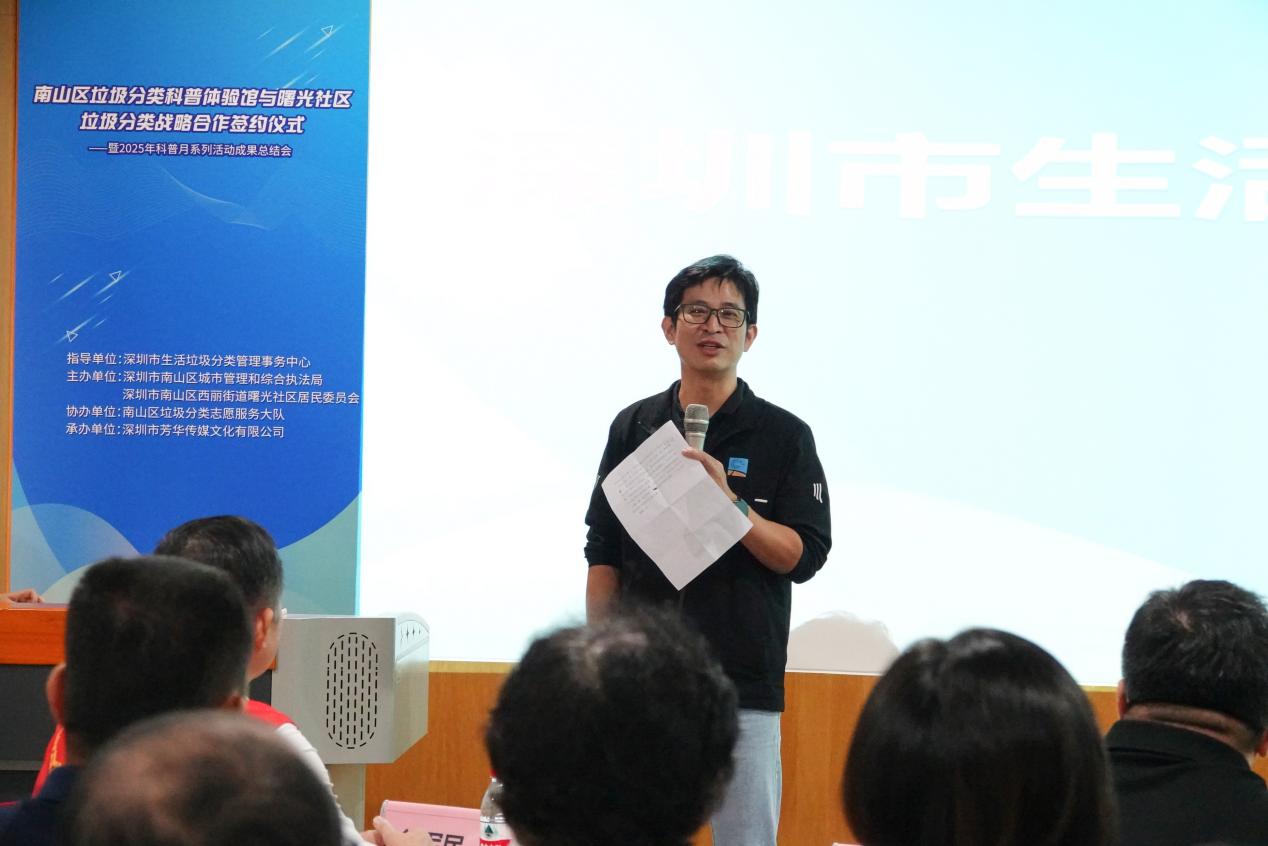 活动在温馨的暖场视频中拉开序幕。华晓峰在致辞中表示,此次合作是南山区构建“垃圾分类—资源再生—全民参与”环保样板的重要实践,希望通过科普馆的专业资源与社区的阵地优势相结合,推动垃圾分类从“知识普及”走向“行为养成”,为深圳建设“国际一流的绿色低碳城市”贡献基层力量。
