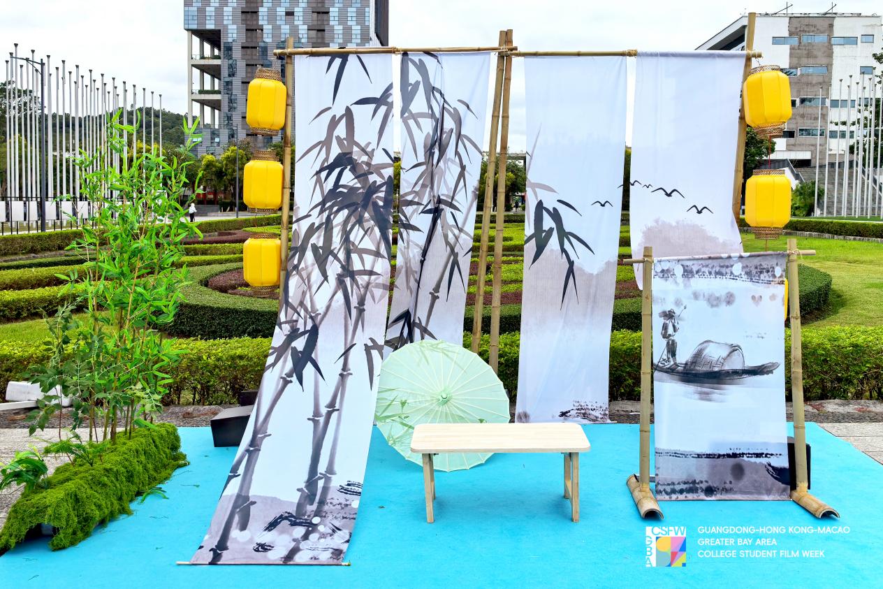 展览现场专为优秀粤产影片《白蛇传·情》设置场景化打卡区,通过纱幔、竹影等场景布置重现影片美学风格,并搭配电影剧照展架回顾影片经典情节。打卡区还配备角色戏服、道具等互动元素,吸引高校学子驻足体验、拍照留念,在互动中体悟传统戏曲与影视融合的艺术魅力。