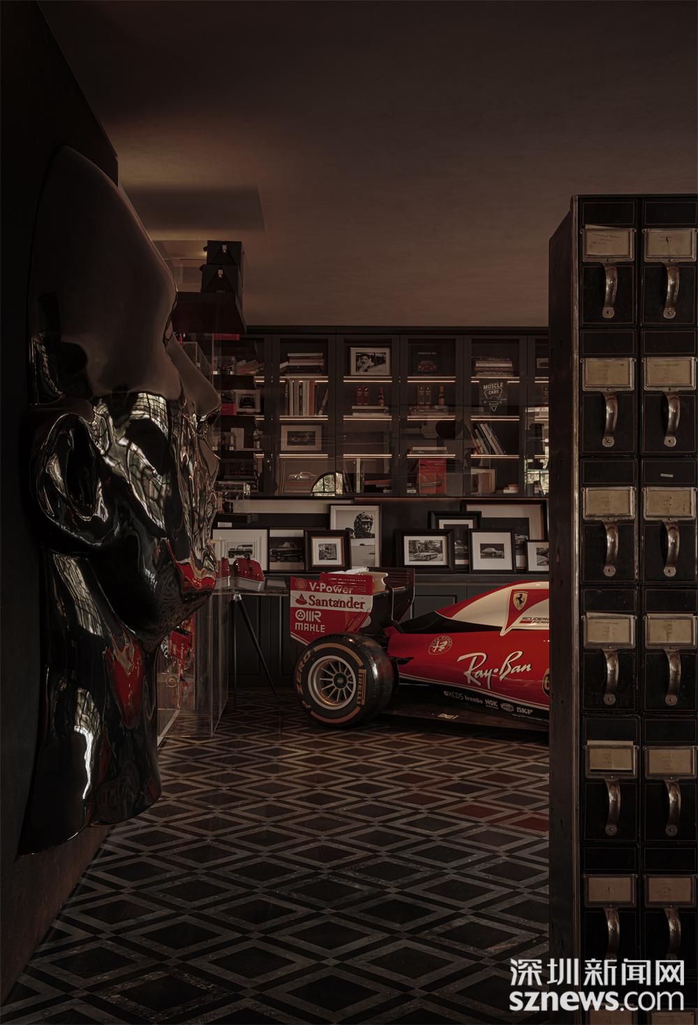 入口右侧的限时展区以深色木材与玻璃构筑的沉稳基调打开文化气场,营造静谧克制的“私人收藏厅”氛围,几何石材地面与博物馆式陈列让机械、速度与文化在此缓缓铺展。作为雍熙荣的首个品牌合作,今年11月,法拉利将Kimi Räikkönen的Ferrari SF16-H(2016 Brazil Grand Prix 原车)及跃马新作Amalfi带入空间,注入鲜明的速度美学。展陈亦引入了经典老爷车收藏——梅赛德斯-奔驰190、路虎卫士Series II、阿斯顿·马丁DB4等,以沉稳复古的绅士情怀塑造对话场景,演绎凝聚品味、激发谈资的文化剧场。