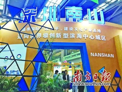 在第十三届文博会上,一号馆的南山展区,以“创意南山,文化未来——质量先行,内涵发展”作为参展主题,展区占地596平方米,居深圳各区之首,52家代表性文化企业参展,包括腾讯、华强方特、环球数码等知名企业,数量创新高。华侨城、华强方特、奥雅等近10家企业在主会场设计独立展区,作为南山展区的有效补充和延伸。庞大的参展规模证明了南山文化产业蓬勃发展的强劲势头。