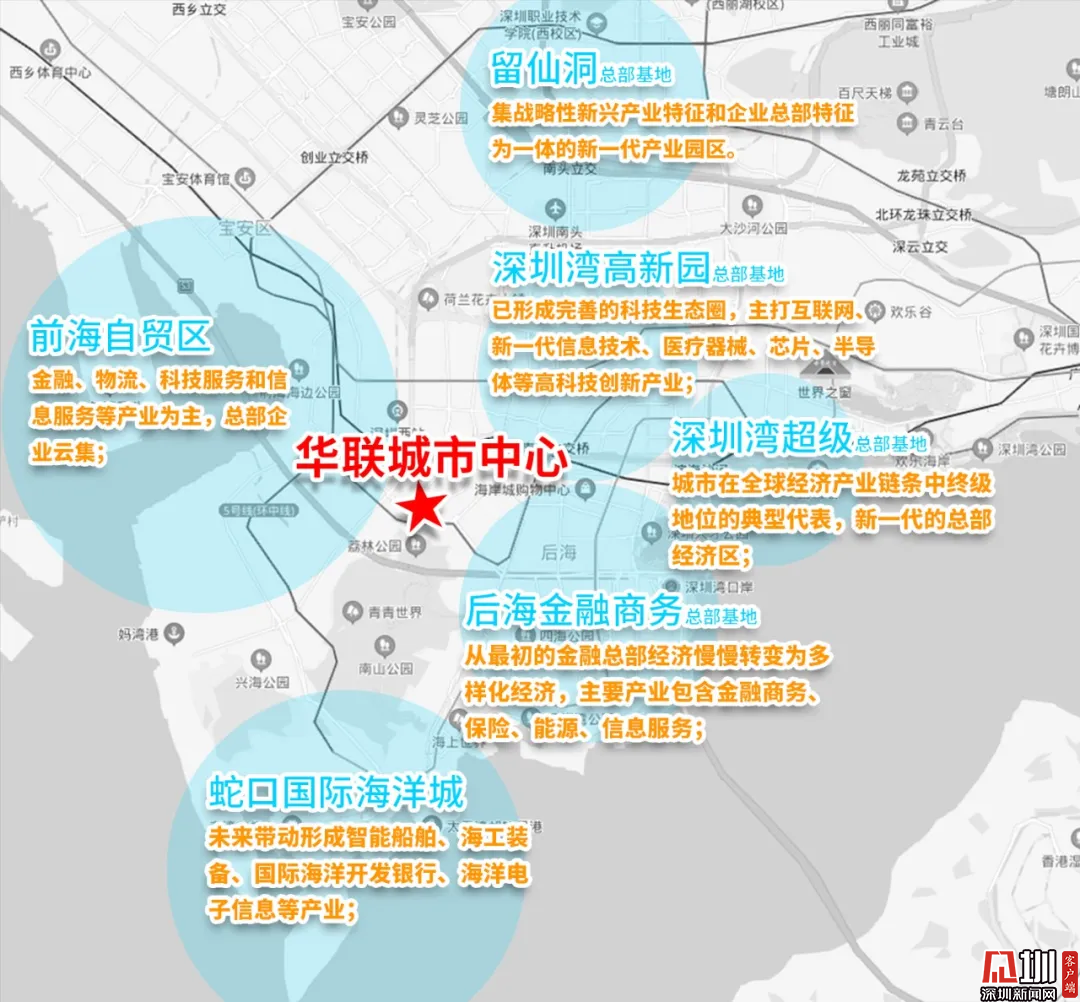 片区紧邻 深圳湾科技园总部基地、后海总部基地、前海自贸区、蛇口国际海洋城等总部基地 ,5G为首的新一代信息技术产业、生物医药产业、先进制造业、文化创意产业、新材料等产业集聚,构成完善的产业生态,将为入驻华联城市中心的企业提供源源不断的新动能。