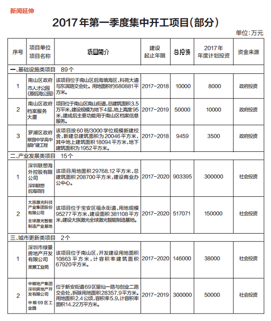 记者从15日举行的项目集中启动活动暨深圳联想后海项目开工活动上获悉,此次新开工的106个项目包括基础设施、产业发展、城市更新三大类,总投资约446.9亿元,预计2017年完成年度投资141.3亿元。其中,