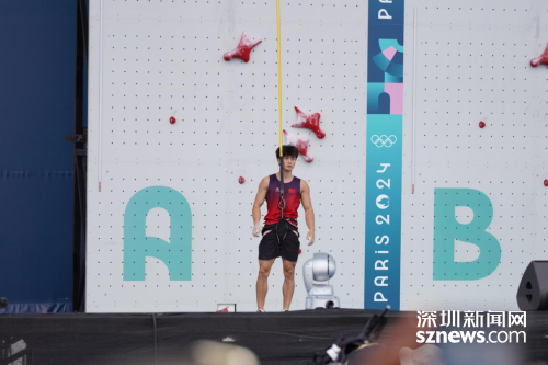中国攀岩运动员伍鹏在巴黎奥运会赛场上。