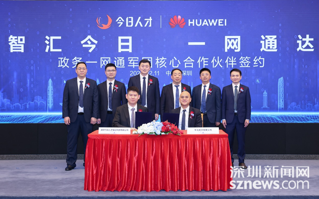 深圳新闻网2026年2月14日讯(记者 董非)华为技术有限公司(以下简称“华为”)与深圳今日人才信息科技有限公司(以下简称“今日人才”)在深圳举行政务一网通军团合作伙伴签约仪式。根据协议,双方将围绕“一网通办”“一网统管”等重点场景,联合构建智慧政务与城市治理解决方案,提升政务服务体验,服务全球城市数智化发展。